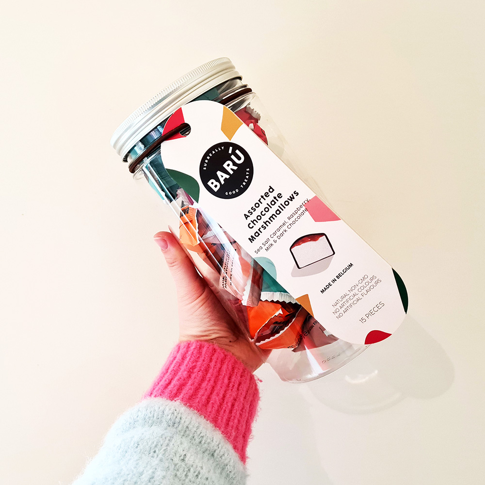 The Barú Gift Jar contains 15 individually wrapped Barú Chocolate Marshmallows in 4 flavours:
