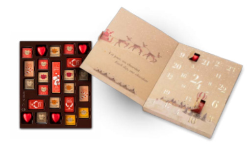 Count down the days to Christmas with Belgian chocolate joy. Behind each of the 24 windows, you’ll find a delicious surprise from Café-Tasse – a mix of mini-tablets, neapolitans, pralines and, on Christmas Eve, an extra special treat.