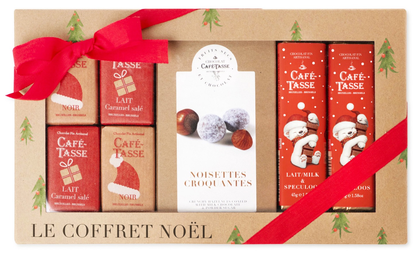 Celebrate the season with this festive gift box from Café-Tasse, perfect for chocolate lovers. Inside, you’ll find an assortment of delightful treats: