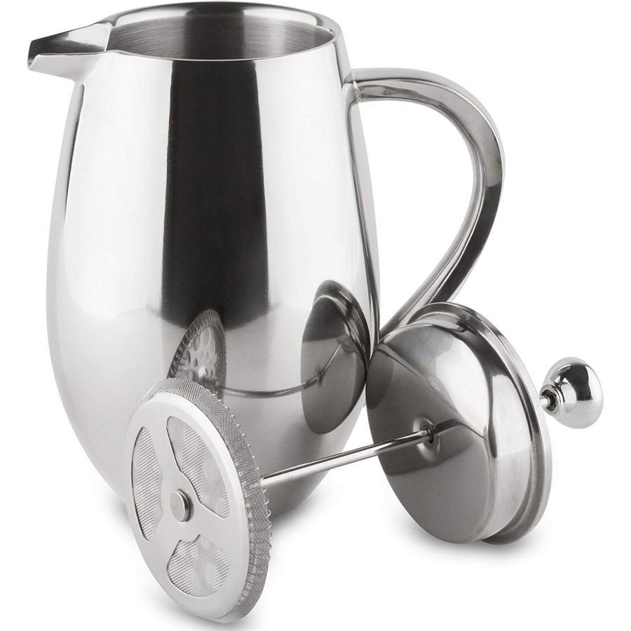 This stainless steel french press from Grunwerg has a double wall insulated structure that keeps the coffee hot for a longer time. The stainless steel body is also a more durable alternative to glass french press coffee makers. Three different sizes available: 350 ml, 800 ml and 1 liter.