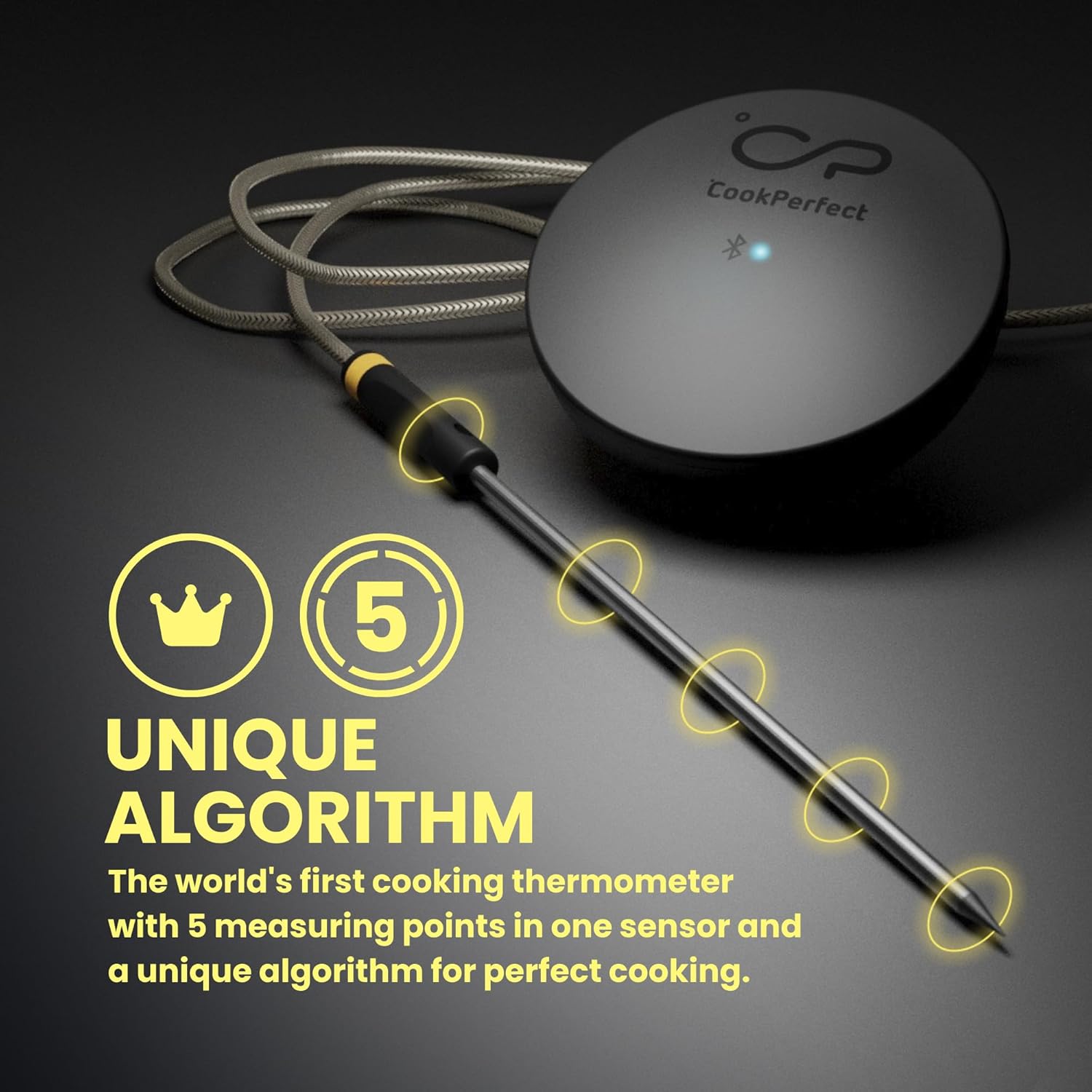 - Wireless meat probe with 5 sensors and built-in Wi-Fi – accurately measures both the meat and ambient temperature