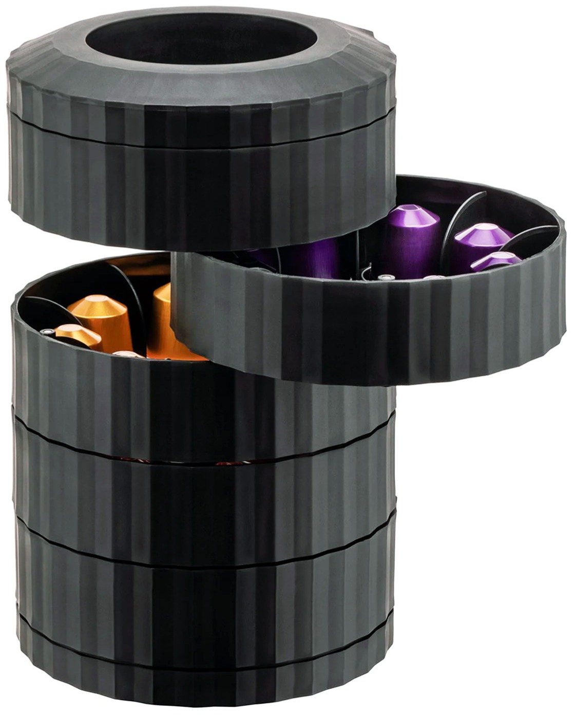 Alessi Plissé kaffekapselhållaren designad av Michele De Lucchi, har fem roterande hyllor gjorda av hållbar termoplast och kan rymma upp till 40 kaffekapslar som är kompatibla med Nespresso-maskiner.