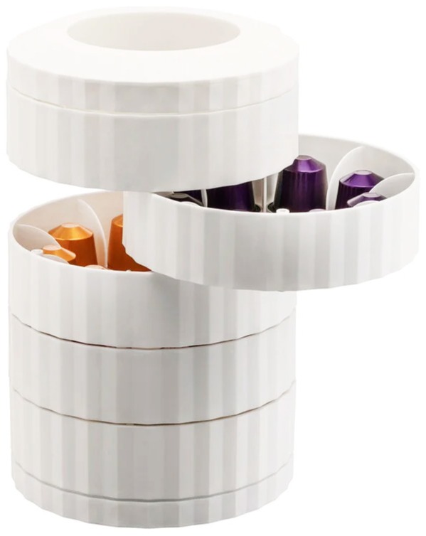 Alessi Plissé kaffekapselhållaren designad av Michele De Lucchi, har fem roterande hyllor gjorda av hållbar termoplast och kan rymma upp till 40 kaffekapslar som är kompatibla med Nespresso-maskiner.