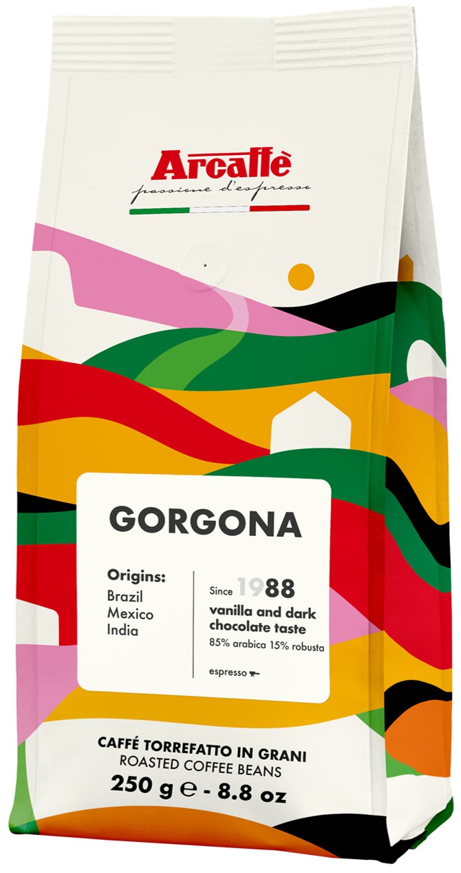 Arcaffe Gorgona är en blandning av ursprungskaffen från Brasilien (Arabica) och Indien (Robusta). Blandningen innehåller 15 % Robusta, och smakpaletten är intensiv, kryddig och balanserad. Kaffet har samtidigt en lätt fruktighet. Njut av kaffet som espresso eller blanda med mjölk för en god cappuccino!