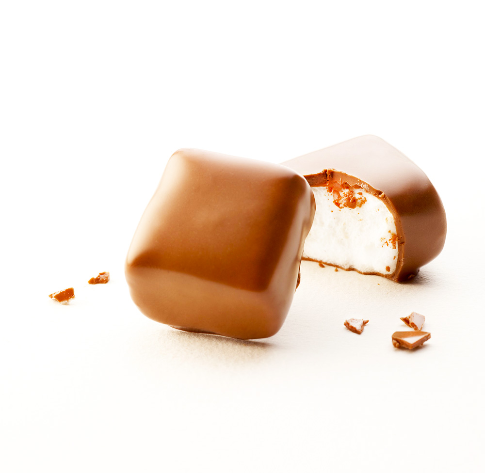 Barús fluffiga Marshmallow-skumkarameller toppade med belgisk mjölkchoklad. Skumkaramellen innehåller äkta bourbonvanilj och honung.