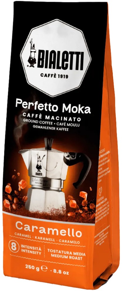 Bialetti Perfetto Moka Caramello malet kaffe med härlig smak av karamell. Kaffet blir bäst tillrett i din mokabryggare.