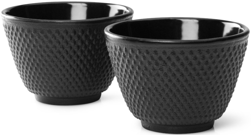 Ett set bestående av två Bredemeijer Xilin-tekoppar i gjutjärn, som perfekt matchar en gjutjärnstekanna. Tekopparna har en emaljerad insida och dubbad ytstruktur.