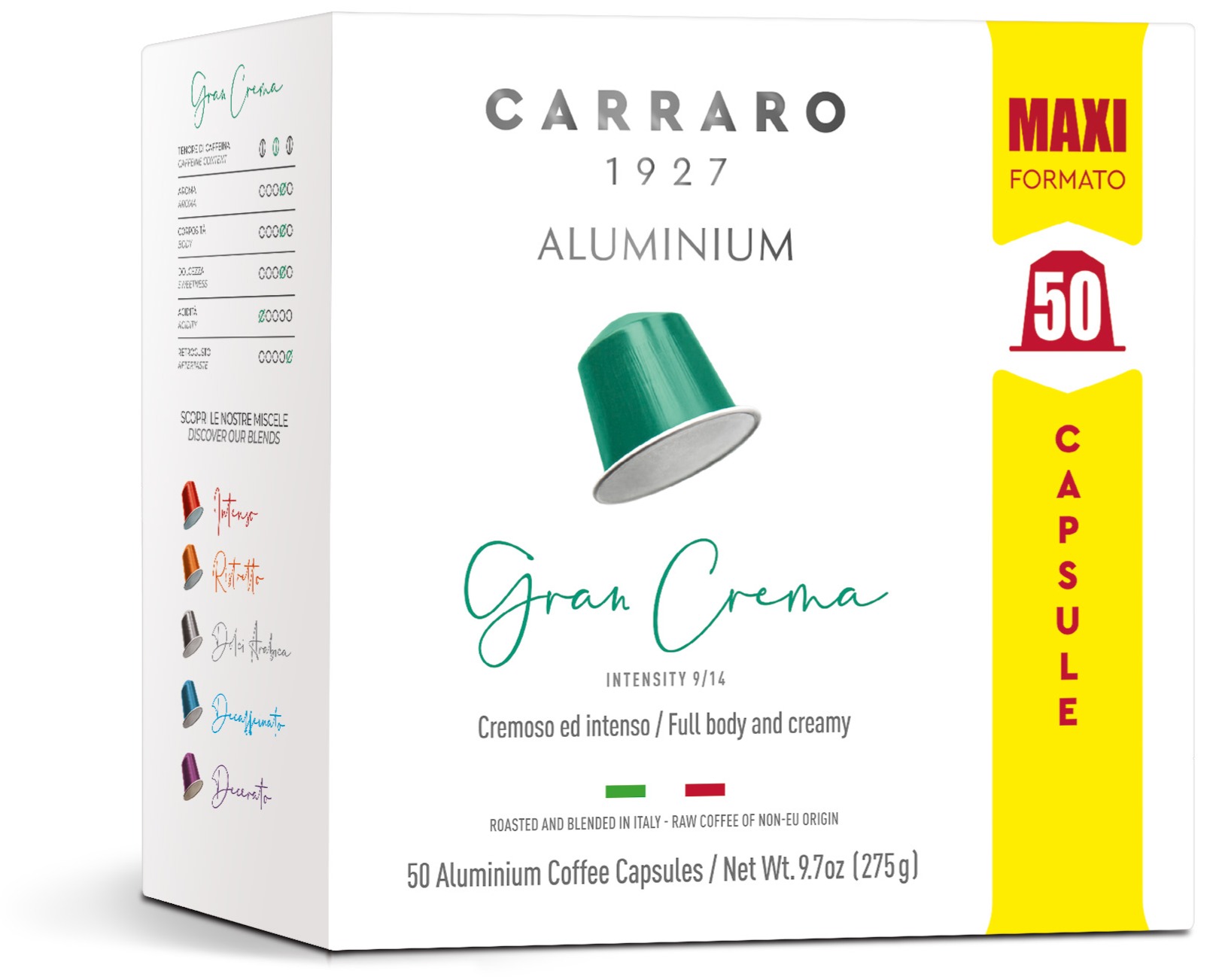 Carraro 1927 Gran Crema kaffekapslarna innehåller en blandning som intensifierar den klassiska smaken av kaffe med en större fyllighet och krämighet som italiensk espresso är känd för.