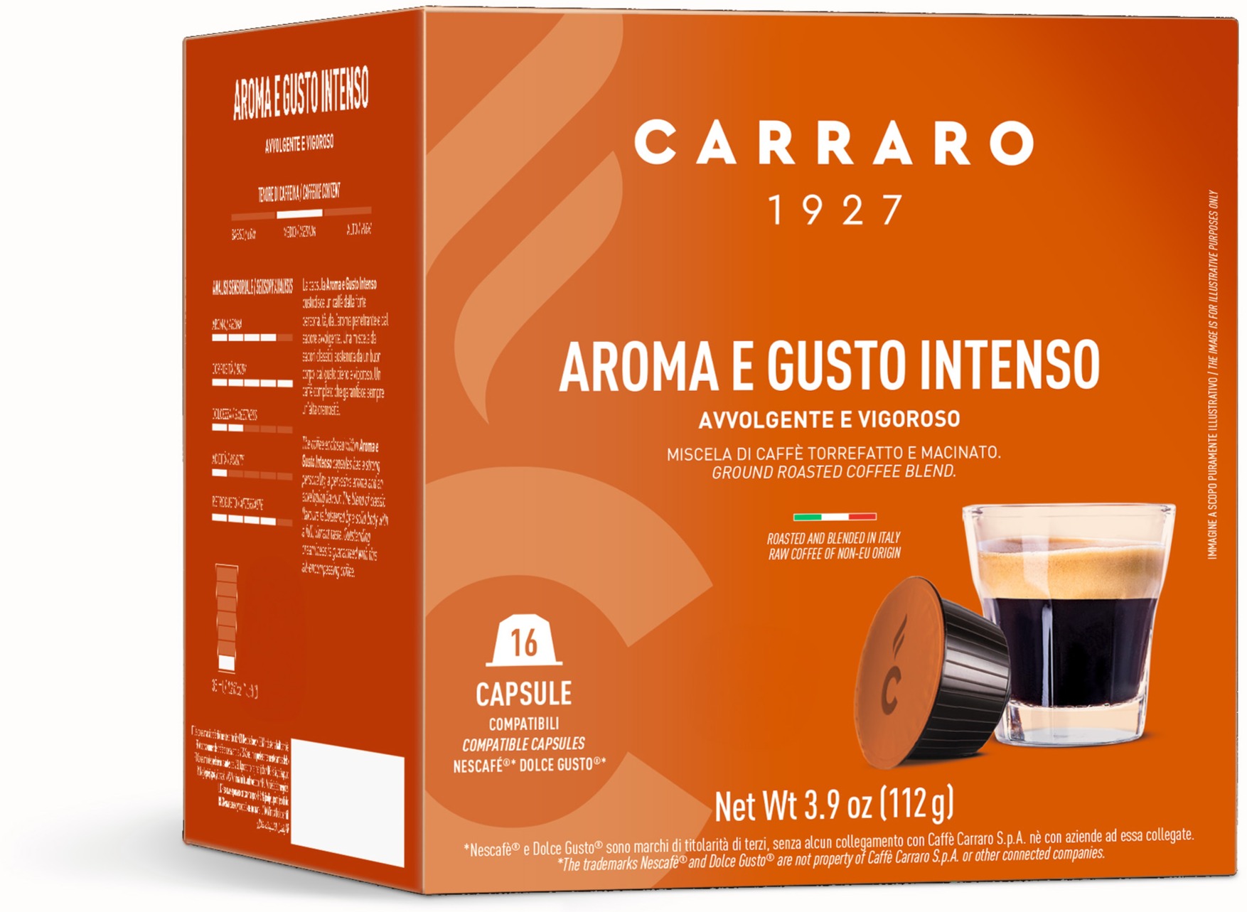 Kaffet i Carraro 1927 Aroma e Gusto Intenso Dolce Gusto®-kompatibla kapslar har en stark personlighet och en intensiv arom. Blandningen av klassiska smaker förstärks av en robust munkänsla med en fyllig, nyanserad smak.