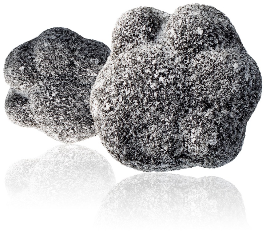 Socker, glukossirap, stärkelse, modifierad stärkelse, ammoniumklorid (=salmiak), lakritsextrakt, salt, färgämne (E153), aromer, stabiliseringsmedel (E471).