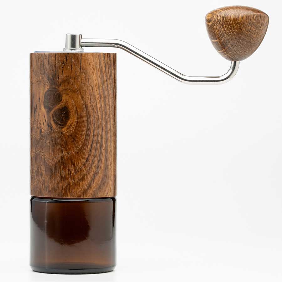 Höljet i vintage-ek ger kvarnen ett tidlöst och hållbart uttryck. Den ergonomiska designen gör malningen smidig och behaglig, och förvandlar varje kaffestund till en liten ritual präglad av kvalitet och hantverk.