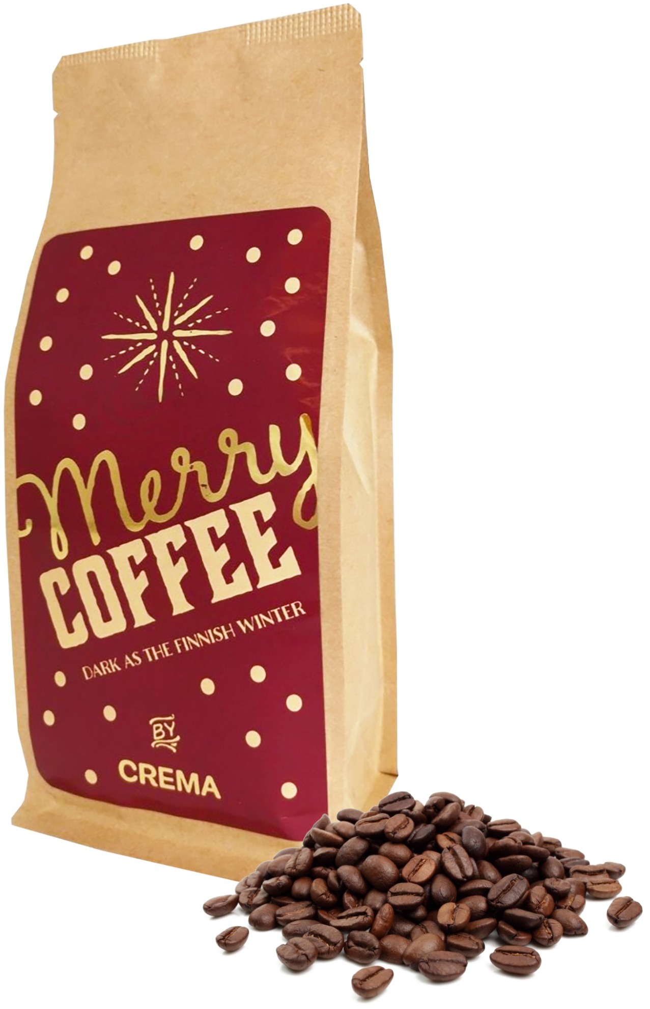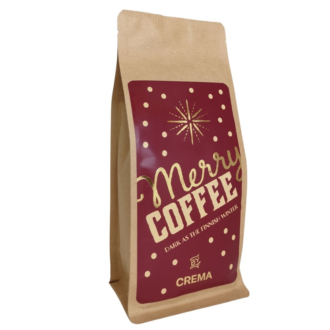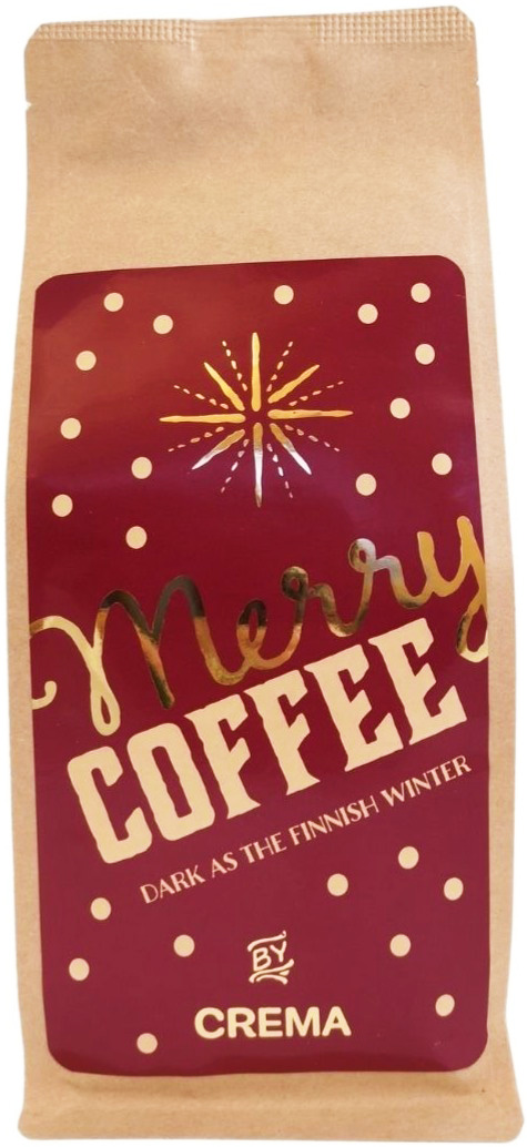 Vi ville skapa ett julkaffe som passar bra ihop med julens maträtter och med söta godsaker. Crema Merry Coffee har en rik smakupplevelse som förbereder på ett mysigt sätt till julfirandet. Kaffet innehåller enbart kaffe, inga julkryddor.