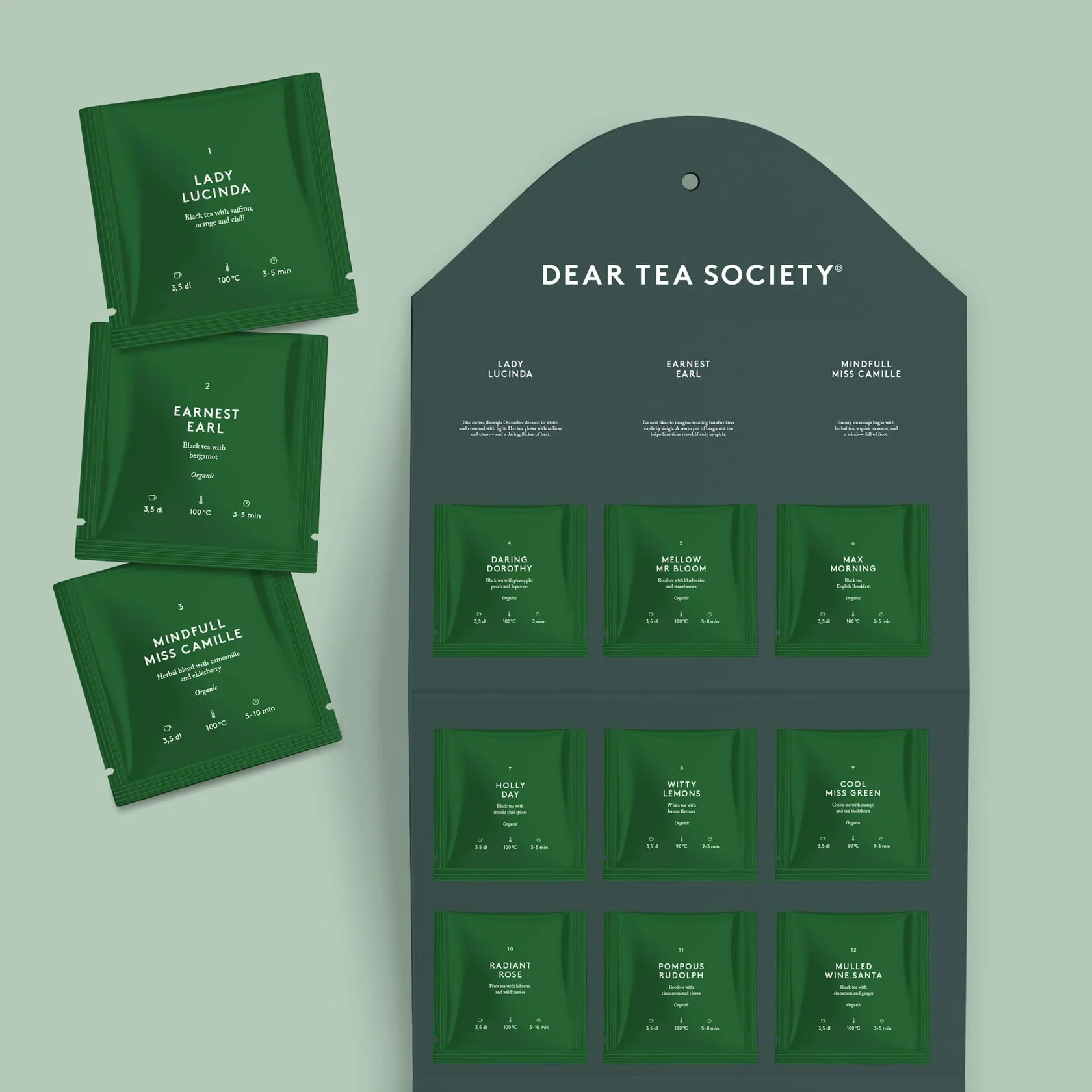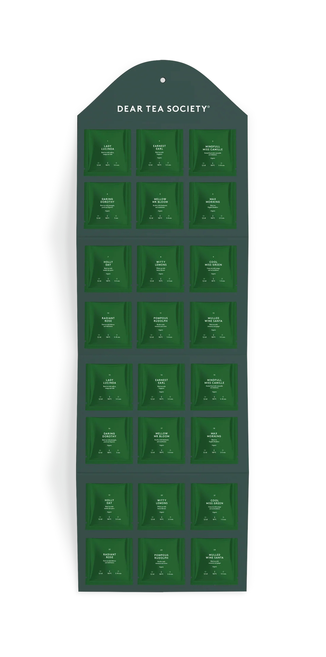 Inuti hittar du en hängare med 24 numrerade tepyramider, var och en med sin egen personlighet och noggrant anpassade brygginstruktioner. Upptäck allt från kraftfulla svarta teer till eleganta vita, fruktiga blandningar och harmoniska örter – en ny tekompis för varje stund under säsongen.