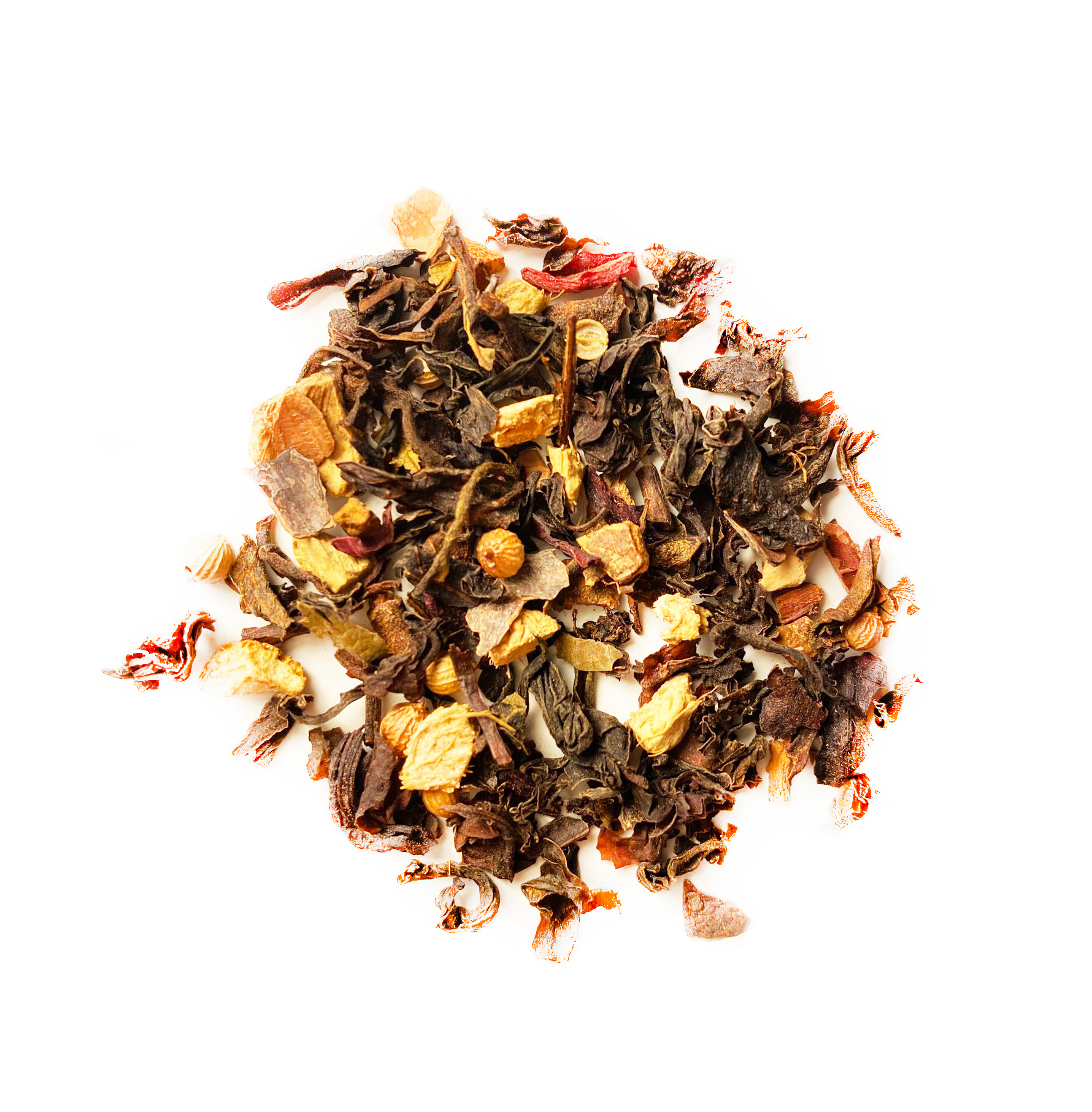Svart te, kanelbitar, ingefära, krossad kryddnejlika, koriander, kakaobönskal, hibiscus, naturlig kola-arom, apelsinskal, björnbärsblad, apelsinolja, naturlig kakao-bittermandelarom, naturlig kardemumma-arom, krossad kardemumma.