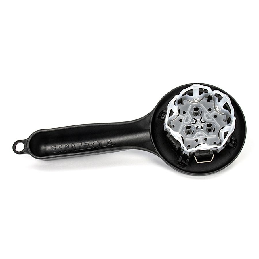 Espazzola består av ett hårt handtag med en koppdel, som kan monteras i bryggruppen som ett portafilter. En skild, flexibel rengöringsdel monteras i koppdelen.