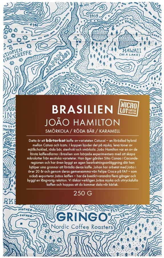 Gringo Nordic Brasilien João Hamilton är ett bärtorkat specialkaffe från Brasilien av varieteten Catucaí, en korsning mellan Catuai och Icatu. Kaffet har en mjuk och len smakprofil med toner av mjölkchoklad, röda bär, stenfrukt och smörkola.