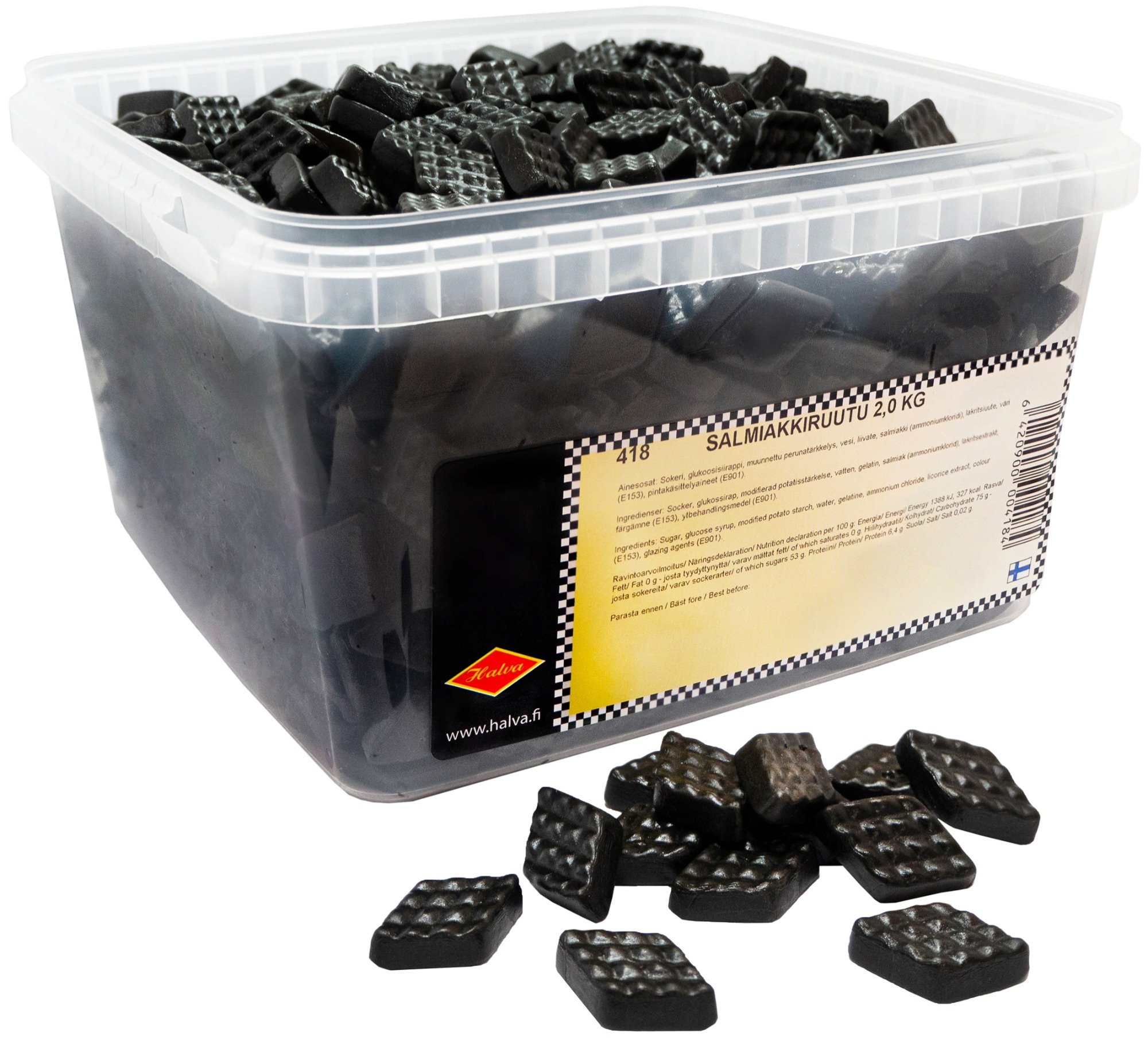 Äkta och ursprungliga, härligt sega Halva Salmiaksötsaker, i sin klassiska diamantform sedan 1960. Tillverkat i Sockenbacka, Helsingfors.