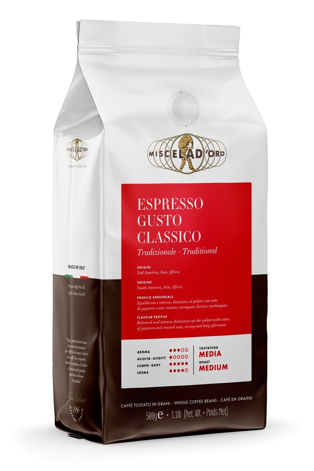 Miscela d'Oro Gusto Classico är en traditionell italiensk espressoblandning med kraftig och chokladig smak samt en fyllig karaktär. Smaken toppas med en dryg crema och en lång, behaglig eftersmak.
