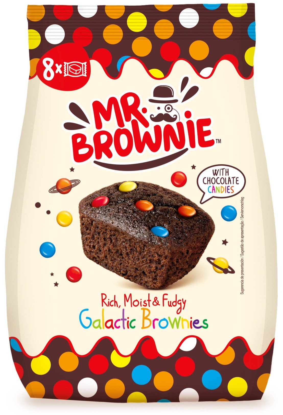 Mr. Brownie Galactic Brownies är klassiska chokladbrownies toppade med färgglada chokladdragéer som ger både ett festligt utseende och en härlig crunch.