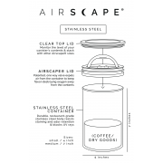 Den ursprungliga Planetary Design Airscape förvaringsburken för kaffe och övriga livsmedel. Locket avlägsnar luft och fukt och skapar en lufttom matförvaring som förlänger livslängden för kaffe, te, mjöl, socker, flingor, kakor, frön, örter, nötter och övriga känsliga matvaror.