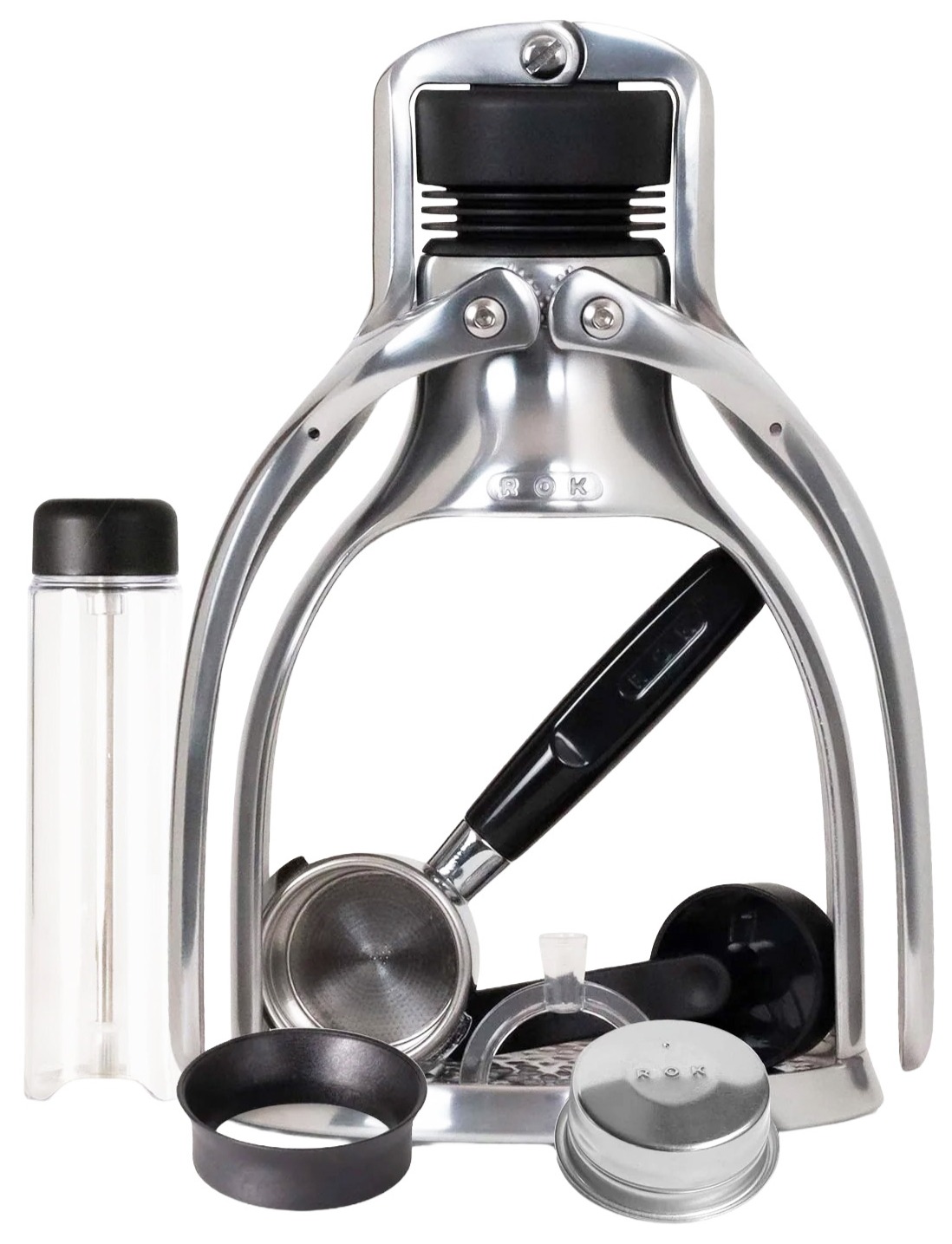 ROK EspressoGC PLUS manuella espressomaskinen är tillverkad av gjutet aluminium, stål och glaskomposit.