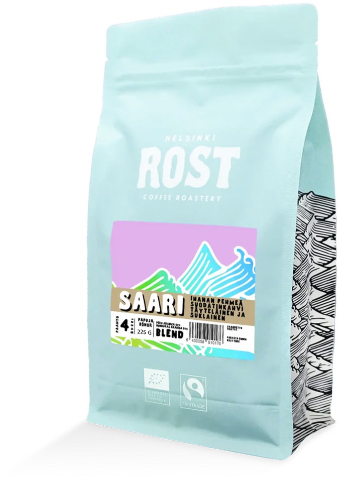 ROST Saari är ett rättvisemärkt, mörkrostat och mjukt ekologiskt bryggkaffe. Kaffet är fylligt och chokladigt med en milt bärig ton. Kaffet passar utmärkt även för dig som gillar mjölk i ditt kaffe - tillsammans med mjölk blir Saari-kaffet fylligt mjölkchokladigt och nötaktigt.