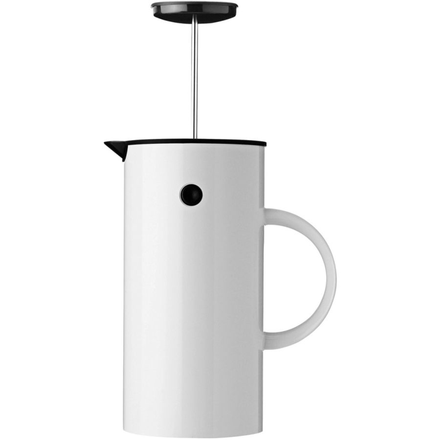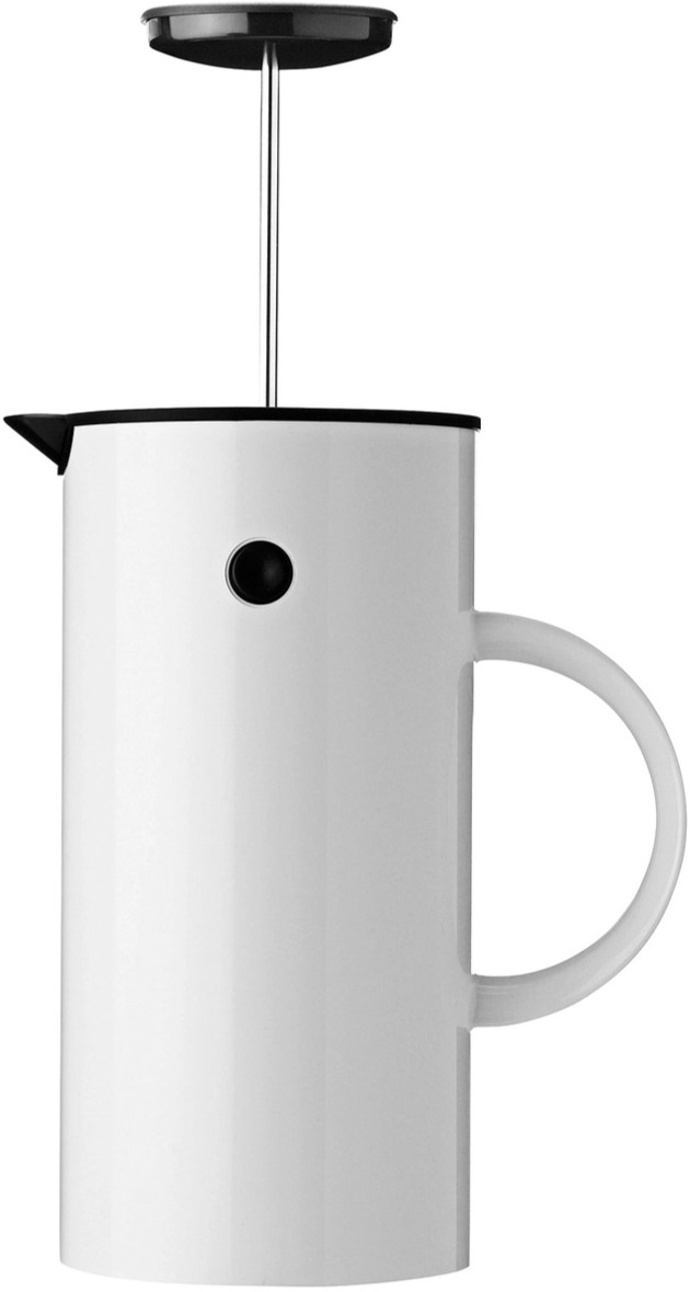 Stelton EM pressobryggaren rymmer åtta koppar kaffe och dess dubbla väggkonstruktion håller kaffet varmt längre. Vrid på locket för att hälla upp kaffet och vrid igen för att stänga.