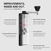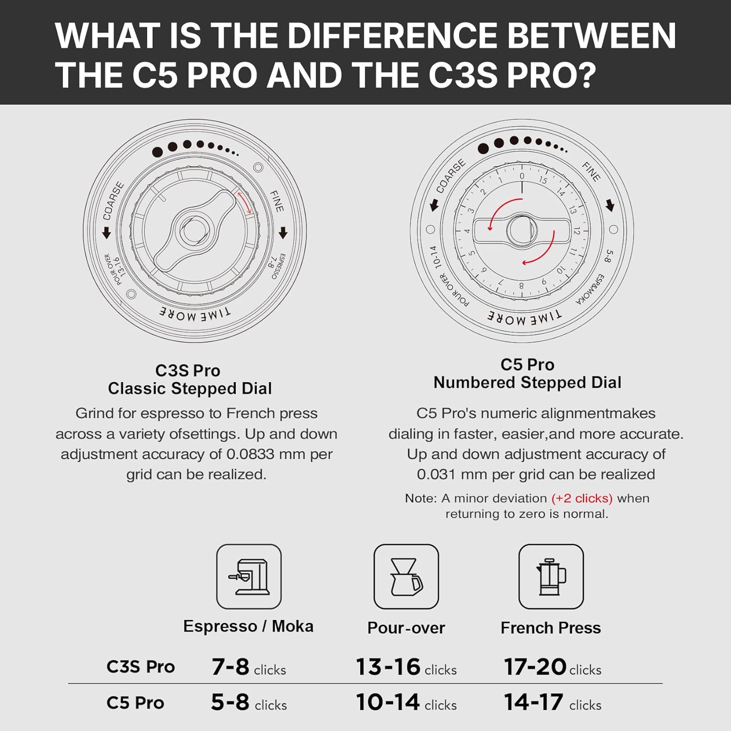 C5 uppgraderar C3:ans 38 mm malsats till en helt ny 42 mm malsats. Den nya satsen ger skarpare malningsprofil, bättre klarhet och mer konsekvent smak när kaffet svalnar. Genom att omkonstruera den inre strukturen och göra kroppen något bredare har Timemore skapat plats för den större malsatsen – utan att kompromissa med kvarnens kompakta och resevänliga format.