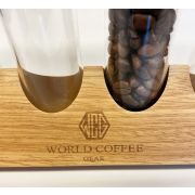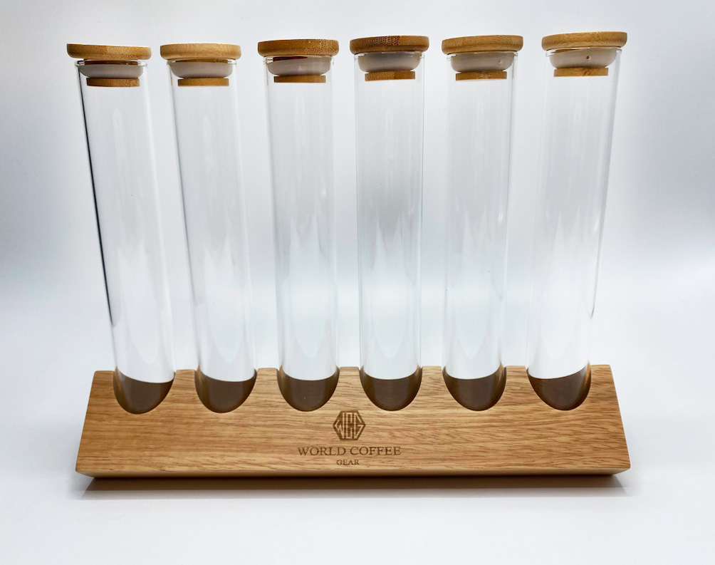 Tube Holder -ställningen från World Coffee Gear är tillverkad av ekträ och har plats för 6 WCG kafferör i glas.